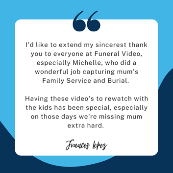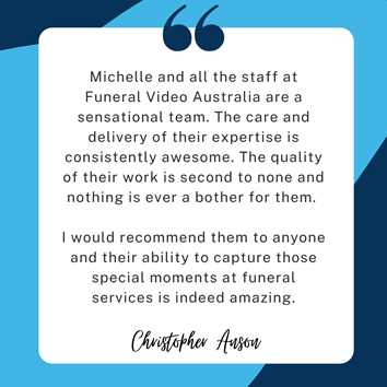 "What a wonderful service, exactly what I needed during such a tough time. Very grateful for FVA, from initial enquiry to the delivery on the day. Sarah was patient & kind with created the slideshow. Annie the AV technician was absolutely divine! The set up and take down was completed on time & respectfully. The slideshow and AV equipment was operated seamlessly. Annie’s smile & support on the day was just perfect. I would recommend Funeral Video to everyone and will most definitely use the service again."